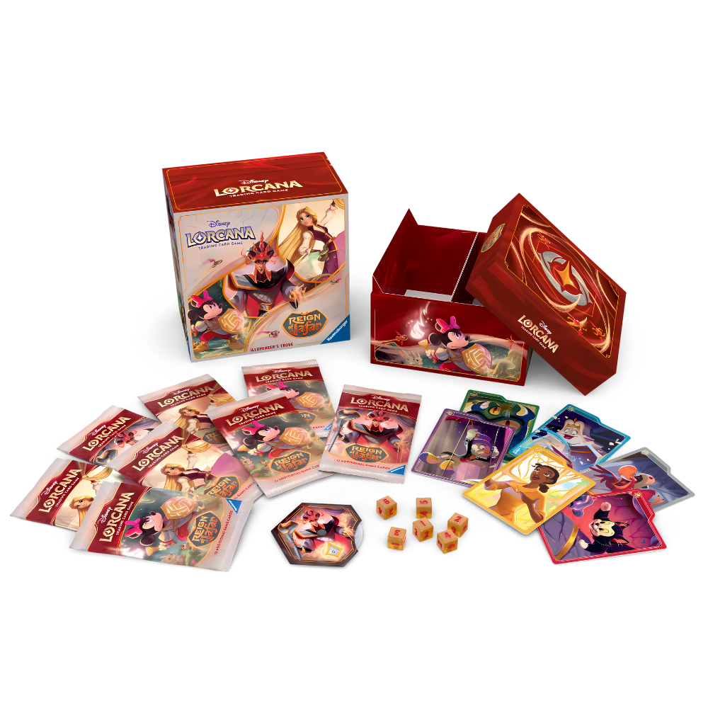 The Illumineer’s Trove includes eight booster packs and contains a full-art storage box with six ink-themed card dividers to keep your Disney Lorcana TCG cards safe and organized by ink.