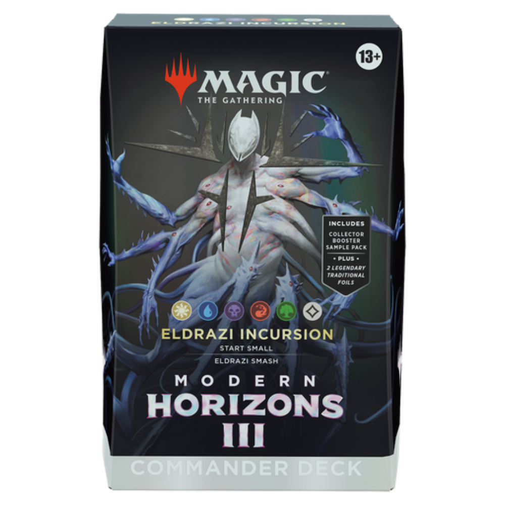 Each deck also comes with a 2-card Collector Booster Sample Pack containing 2 alt-border cards from the Modern Horizons 3 set, including 1 Rare or Mythic Rare and at least 1 Traditional Foil card