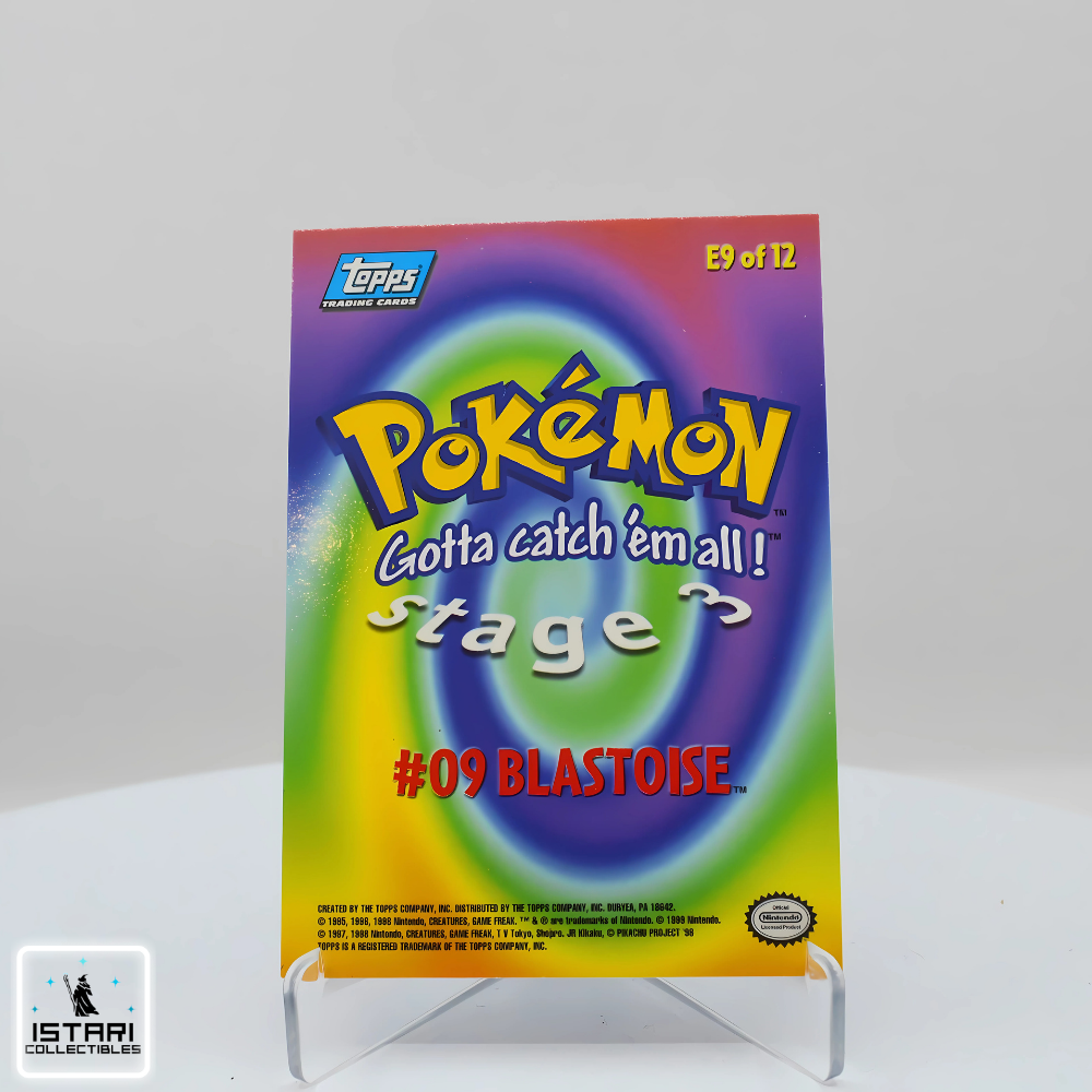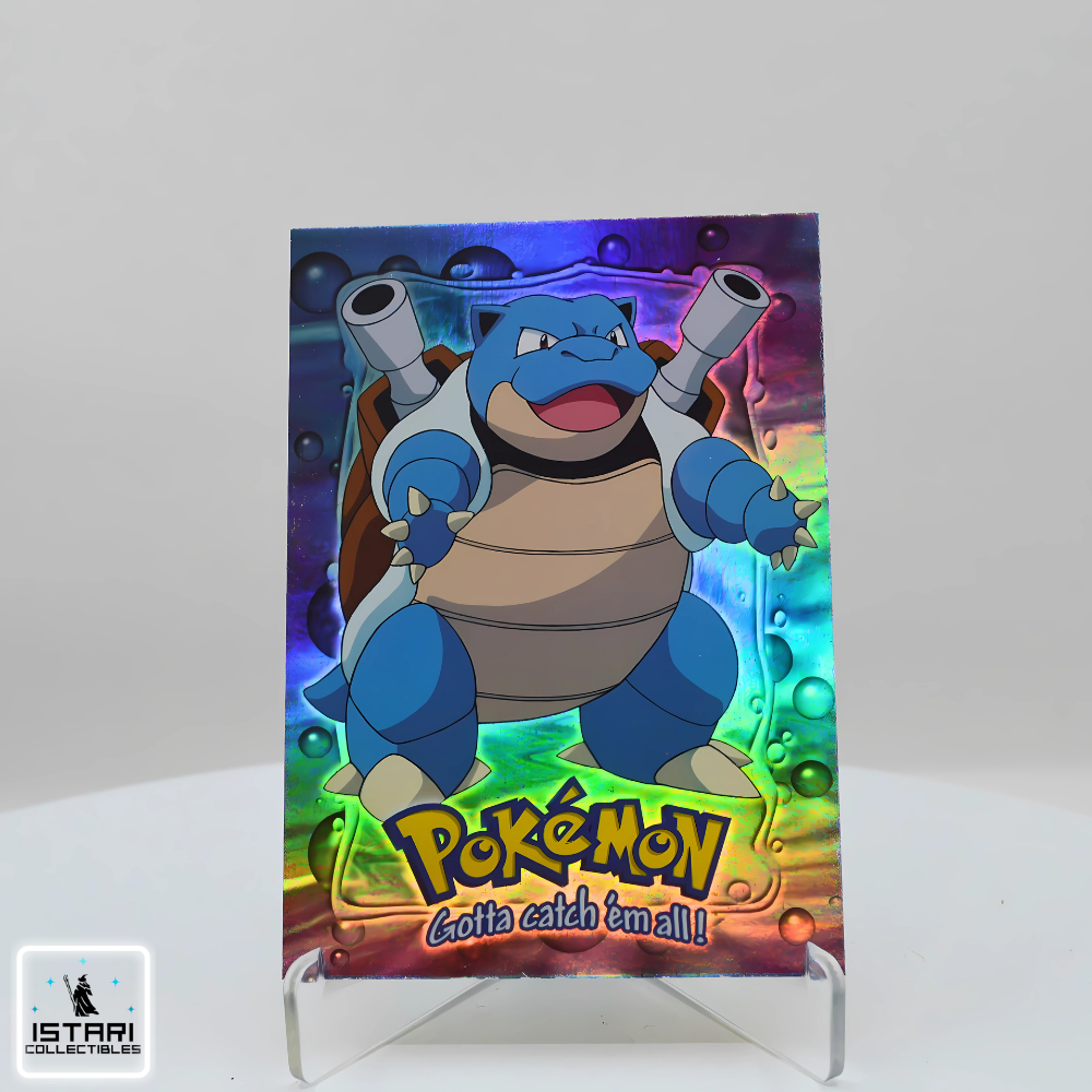 Step back into the height of Pokémon’s late-90s craze with the Topps Pokémon: The First Movie Rainbow Foil Blastoise, released in 1999 to celebrate Pokémon: The First Movie – Mewtwo Strikes Back. Unlike traditional TCG releases, these Topps cards feature a distinctive rainbow foil finish and bold illustrated design, making them instantly recognizable among vintage Pokémon collectibles.