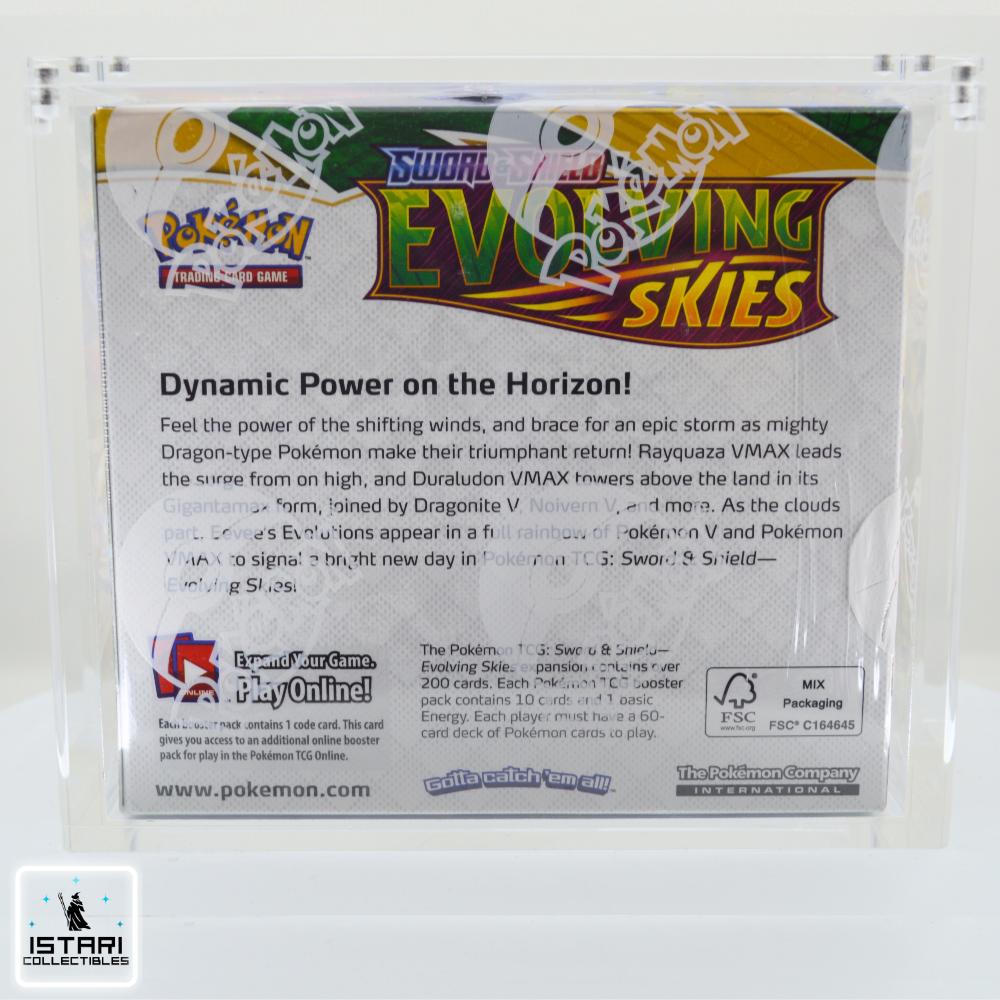 Each sealed booster box contains 36 packs of 10 cards, giving you unparalleled opportunities to pull some of the most iconic cards of the modern era. With its combination of nostalgic Pokémon, premium alternate arts, and tournament-level playables, Evolving Skies has achieved legendary status within just a few short years. A true centerpiece for collectors and investors alike, this booster box is a must-have for anyone seeking to own one of the crown jewels of Sword & Shield TCG history.