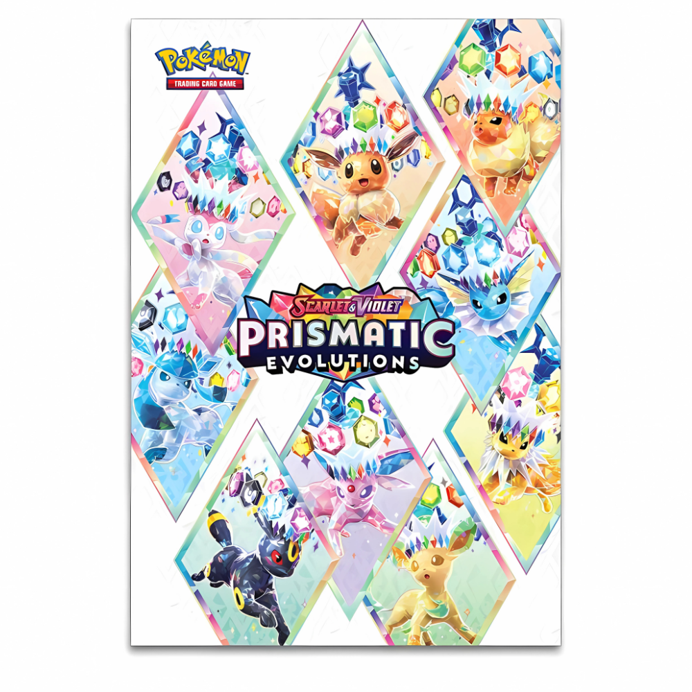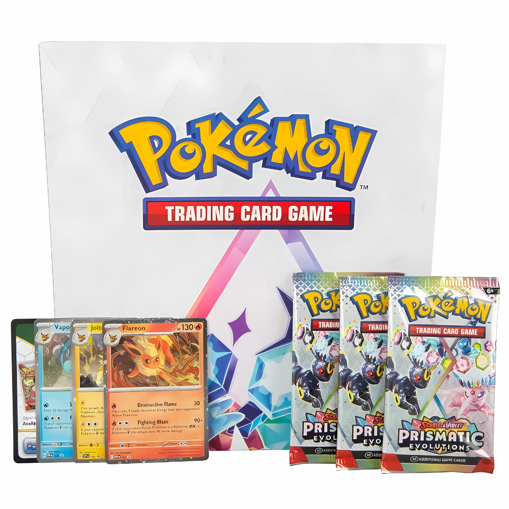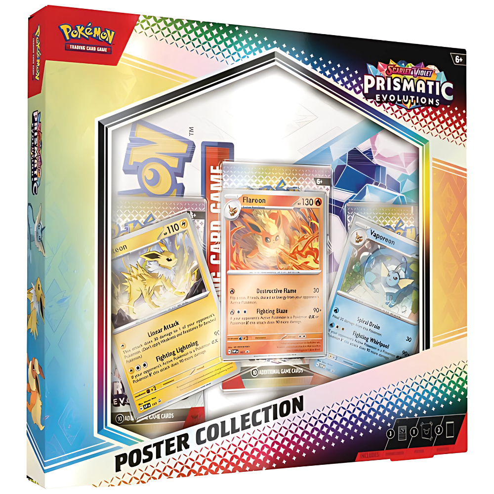 Discover a rainbow of Eevee friends! Eevee’s three Evolutions originally discovered in the Kanto region are beloved by Pokémon Trainers across the land, and now you can add them to your own collection as foil promo cards! You’ll also get a poster featuring the special Scarlet & Violet—Prismatic Evolutions expansion, along with three booster packs to open. The only question is which cards you’ll find inside them!