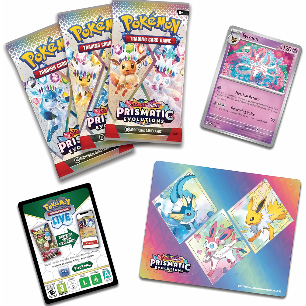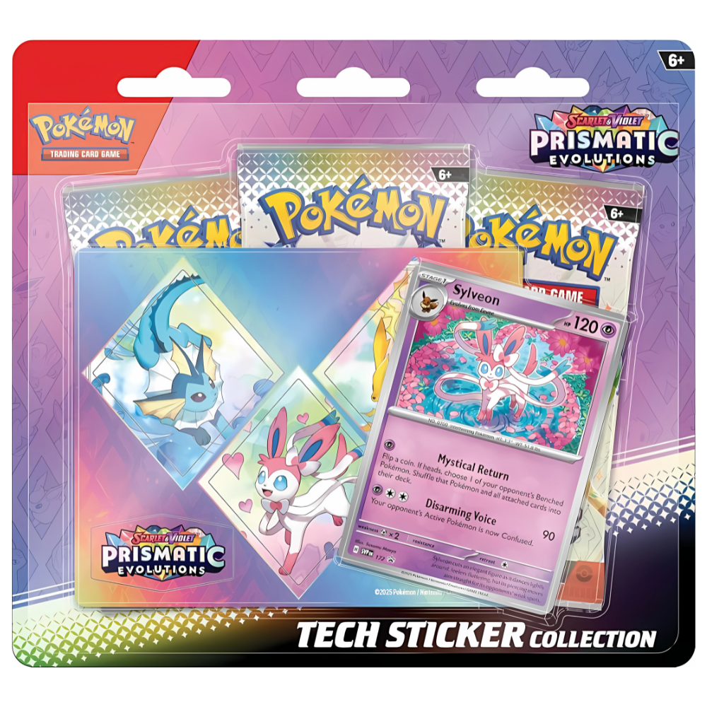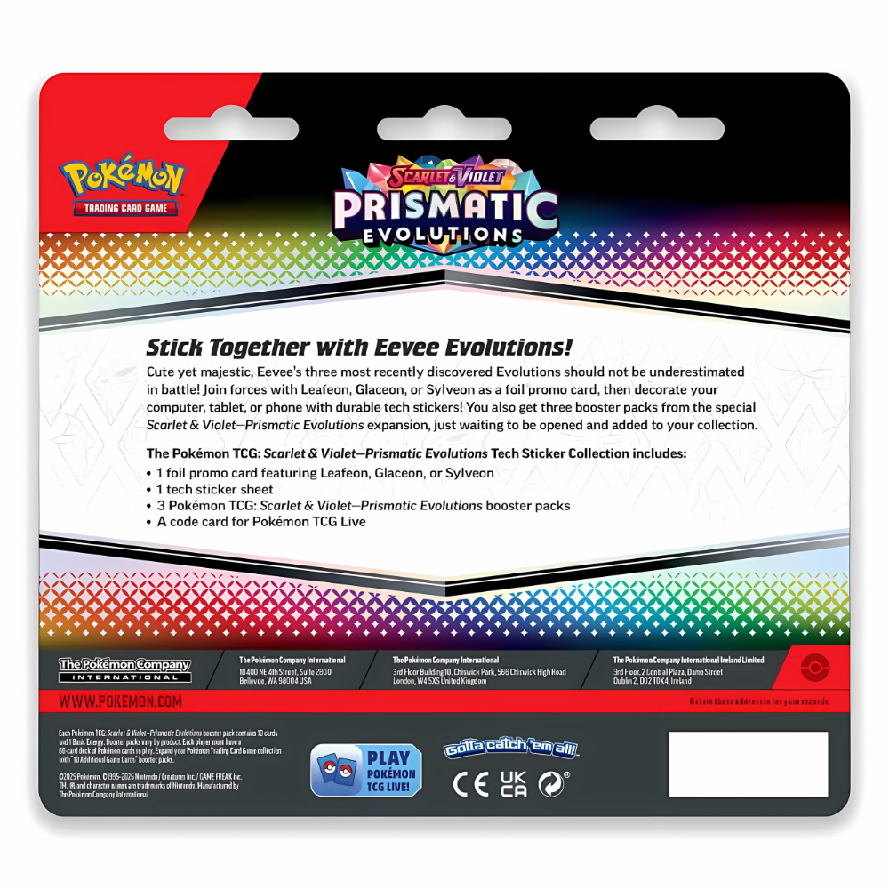 Cute, majestic, and fierce, Eevee’s three most recently discovered Evolutions should not be underestimated in battle. Join forces with verdant Leafeon, icy Glaceon, or lovable Sylveon as a foil promo card, then decorate your computer, tablet, or phone with durable tech stickers. You can also evolve your Pokémon Trading Card Game collection with three booster packs from the Scarlet & Violet—Prismatic Evolutions expansion. The Pokémon TCG: Scarlet & Violet—Prismatic Evolutions Tech Sticker Collection includes: