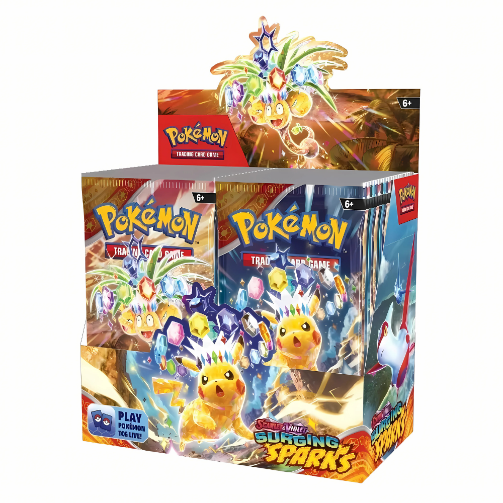 Terawatts of electricity crash down from the sky in a tropical paradise, setting the stage for the supercharged Pikachu ex! With the power of a Stellar Tera Pokémon ex, it lights up the shoreline, revealing a parade of dragon Pokémon led by the towering Alolan Exeggutor ex! Archaludon ex and Latias ex round out the horde, while new ACE SPEC cards and more new Pokémon ex bring surprises of their own. Currents crackle and dragons roar in the Pokémon TCG: Scarlet & Violet—Surging Sparks expansion!