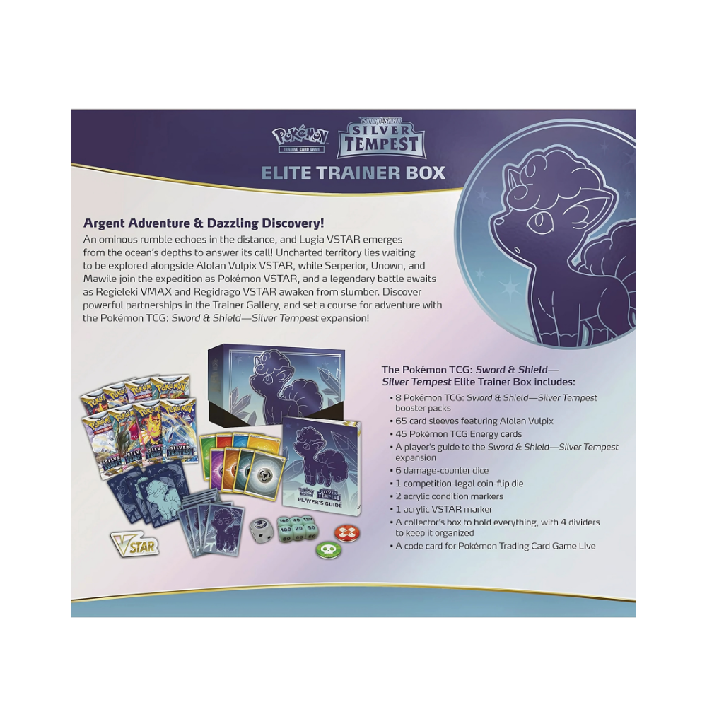 An ominous rumble echoes in the distance, and Lugia VSTAR emerges from the ocean’s dark depths to answer its call! Explore uncharted territory with adventurous expedition companions including Alolan Vulpix VSTAR, Serperior VSTAR, Unown VSTAR, and Mawile VSTAR. Meanwhile, a legendary battle awaits as Regieleki VMAX and Regidrago VSTAR awaken from slumber. Discover powerful partnerships in the Trainer Gallery, and set a course for adventure with the Pokémon TCG: Sword & Shield—Silver Tempest expansion!