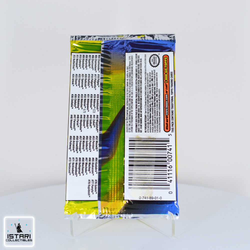 Elevate your Pokémon collection with a Topps Chrome Series 1 booster pack. This set was part of a special collection that was released in 2000 by Topps marking a unique collaboration with Pokémon using their signature chrome card technology. The primary feature of the Topps Chrome cards is the use of a shiny, metallic, and reflective chrome finish making them more visually striking compared to regular cards. The set consists of 90 base cards featuring artwork from the Pokémon: The Movie 2000 and a range of iconic range of first generation Pokémon. Each pack contains 4 cards. Pikachu, Charizard and Mewtwo are the standout cards in the set and any card found in the ultra rare refractor Chrome is highly sought after. This booster pack, like the cards in it stands out for its chrome design, rarity, and nostalgic value. It's a collector's treasure and remains a statement piece for collectors.