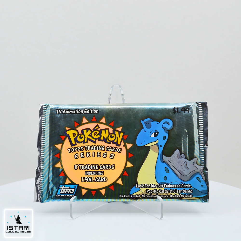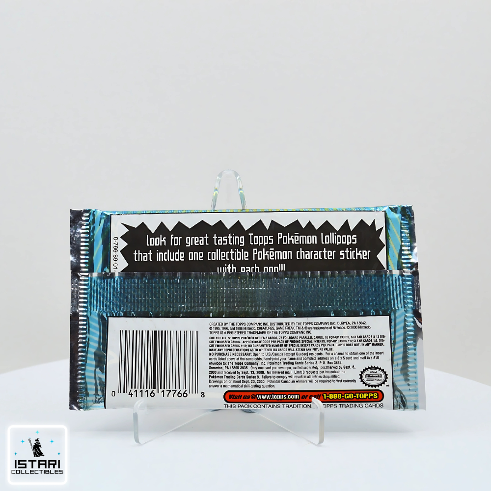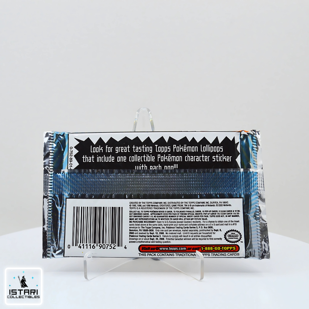 Elevate your Pokémon collection with this Topps Series 3 full art set. The set was released in 2000 as part of the continuing collaboration between Topps and the Pokémon franchise.Tet moved into the Johto region (the second generation of Pokémon) introduced in Pokémon Gold and Silver. This series featured new Pokémon from the Johto region, such as Chikorita, Cyndaquil, Totodile, and legendary Pokémon like Ho-Oh and Lugia. The set continues to have holo-foil, puzzle and sticker cards as the main pulls. It is a highly collectible set, since the set included cards from Pokémon Gold and Silver, it was a transition into a new era of Pokémon, which contributed to the nostalgia and collectability.
