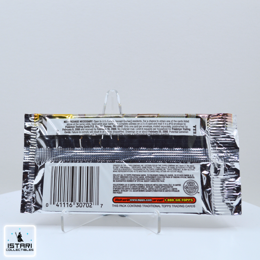 Elevate your Pokémon collection a Topps Pokémon: The First Movie booster pack. The set was released in 1999 to coincide with the release of the Pokémon: The First Movie - Mewtwo Strikes Back. The set was designed to capture the excitement surrounding the film's debut and provide fans with collectible cards featuring characters, scenes, and key moments from the movie. The set has 72 card which action shots from the film, highlighting Pokémon like Pikachu, Mewtwo, Mew, and other iconic characters from the movie. The design of the cards was vibrant and included stills from the animated movie, along with the name of the Pokémon or scene depicted. Inside the packs, collectors could find a mix of base cards, holographic inserts, and occasionally the rare puzzle or promo cards.Many fans still seek out these cards today as part of their Pokémon collections.