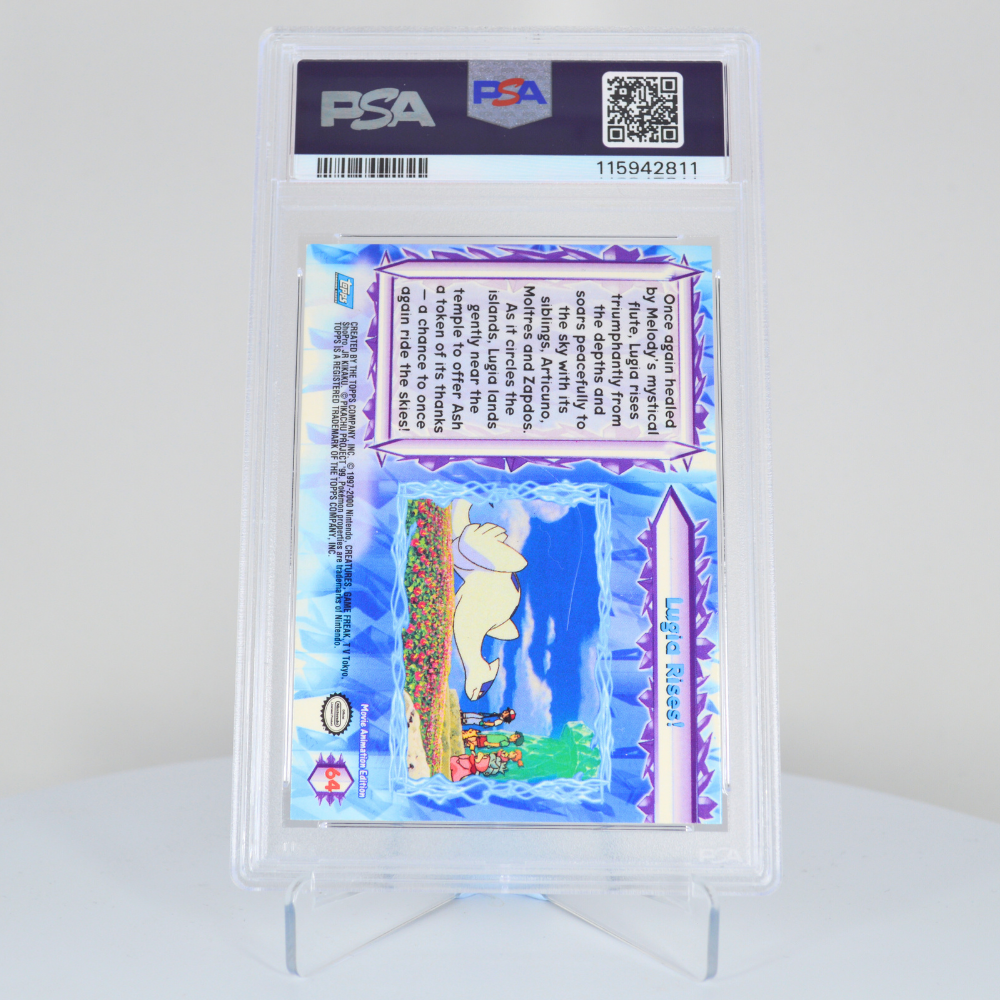 Own a graded piece of Pokémon cinematic history with the “Lugia Rises” Rainbow Foil card, part of the Topps Pokémon: The First Movie set released in 1999. Unlike traditional TCG cards, this Movie Edition captures one of the most dramatic moments from Pokémon: The First Movie – Mewtwo Strikes Back, combining vivid artwork with a shimmering rainbow foil finish.