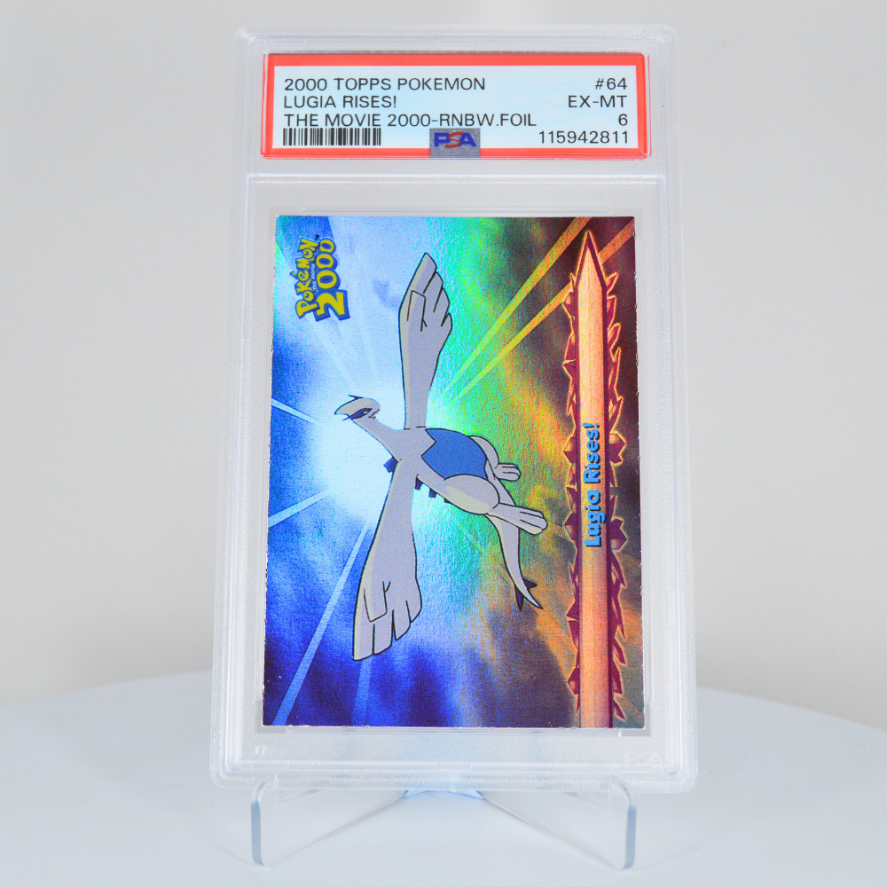 A must-have for Topps Movie enthusiasts, the “Lugia Rises” Rainbow Foil PSA 6 preserves the artistry, excitement, and historical significance of Pokémon’s late-90s silver screen debut.