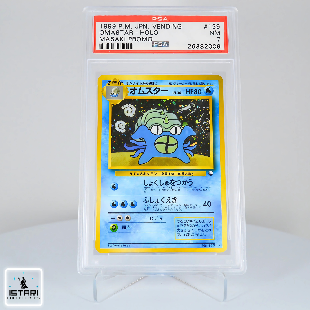 Elevate your Pokemon collection with this rare and highly sought-after Omastar 1999 Japanese Masaki Promo Card. The Masaki promo set features a total of 5 holofoil card artworks by Tomokazu Komiya including Gengar, Golem, Alakazam, Machamp & Omastar. Only available to Japanese residents through a special mail in campaign back in April 1999 - to receive a Masaki card, you had to mail in a "pass card" that was only sold in random vending machine sheets, during a short promotional period. This incredibly unique distribution method means coming across a Masaki card in good condition is a rare find - it is not available in any theme decks, sets or booster packs. Graded PSA 7 (Near Mint) - perfect for collectors looking to start and/or complete a small, but exclusive vintage grail set.